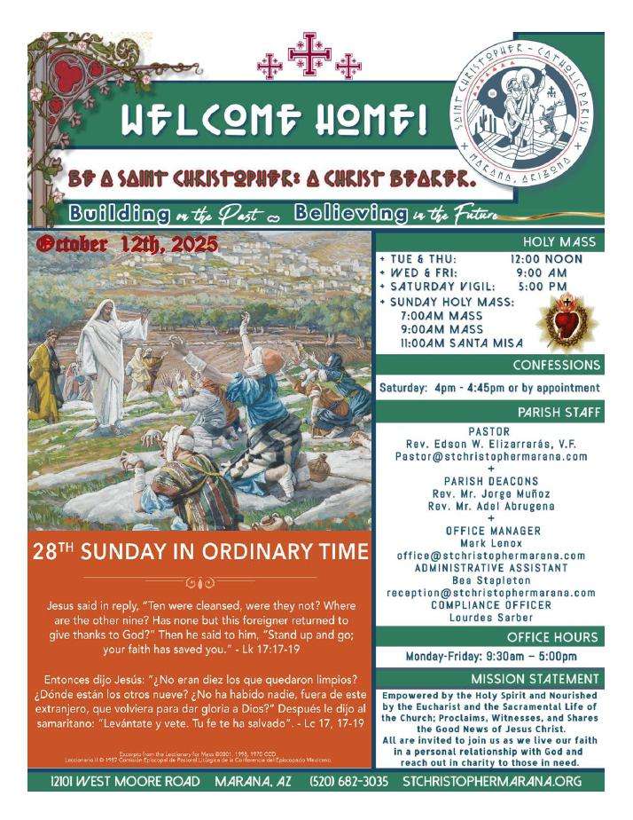 >+++++<Our second collection after Communion will be for the Diocese of Tucson Catholic Schools Collection. Envelopes can be found in the pews.